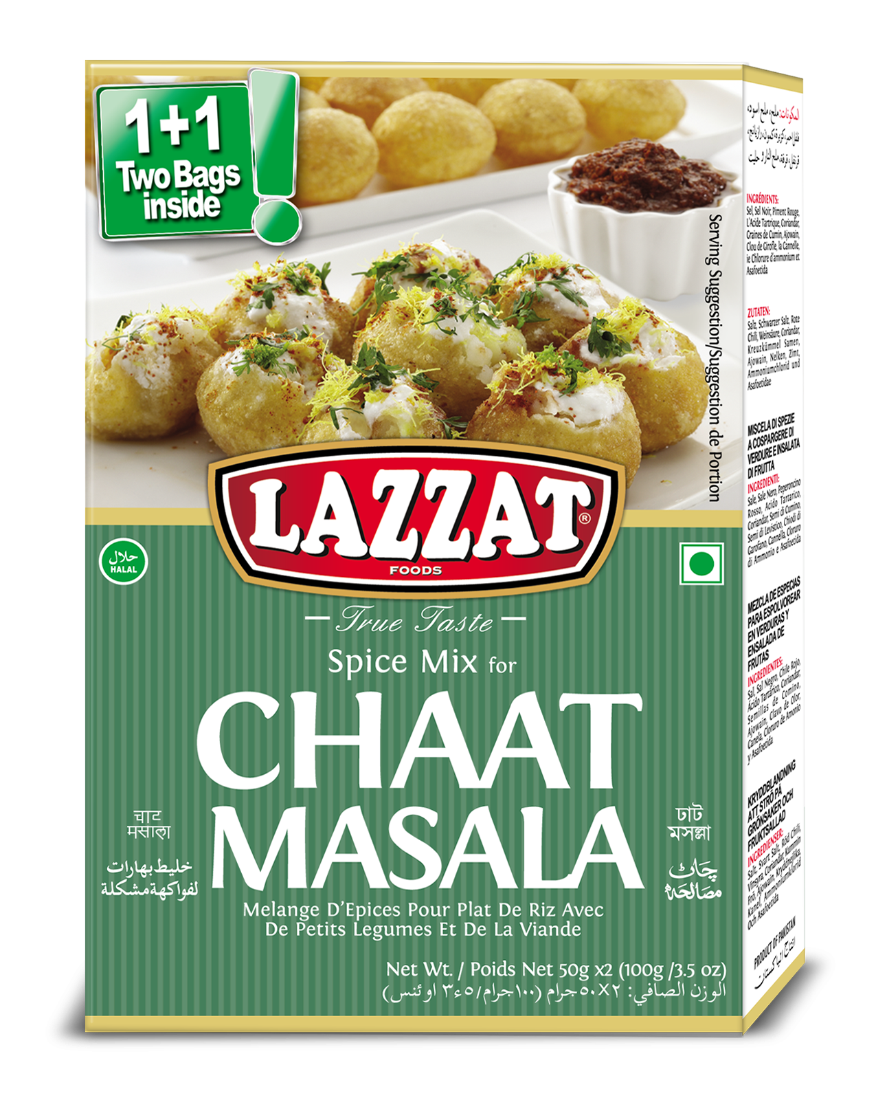 The Lazzat Chaat Masala powder is a fresh take on the traditional spice-mix. This mixture contains freshly ground herbs and spices to create the perfect combination of spicy and tangy flavors.