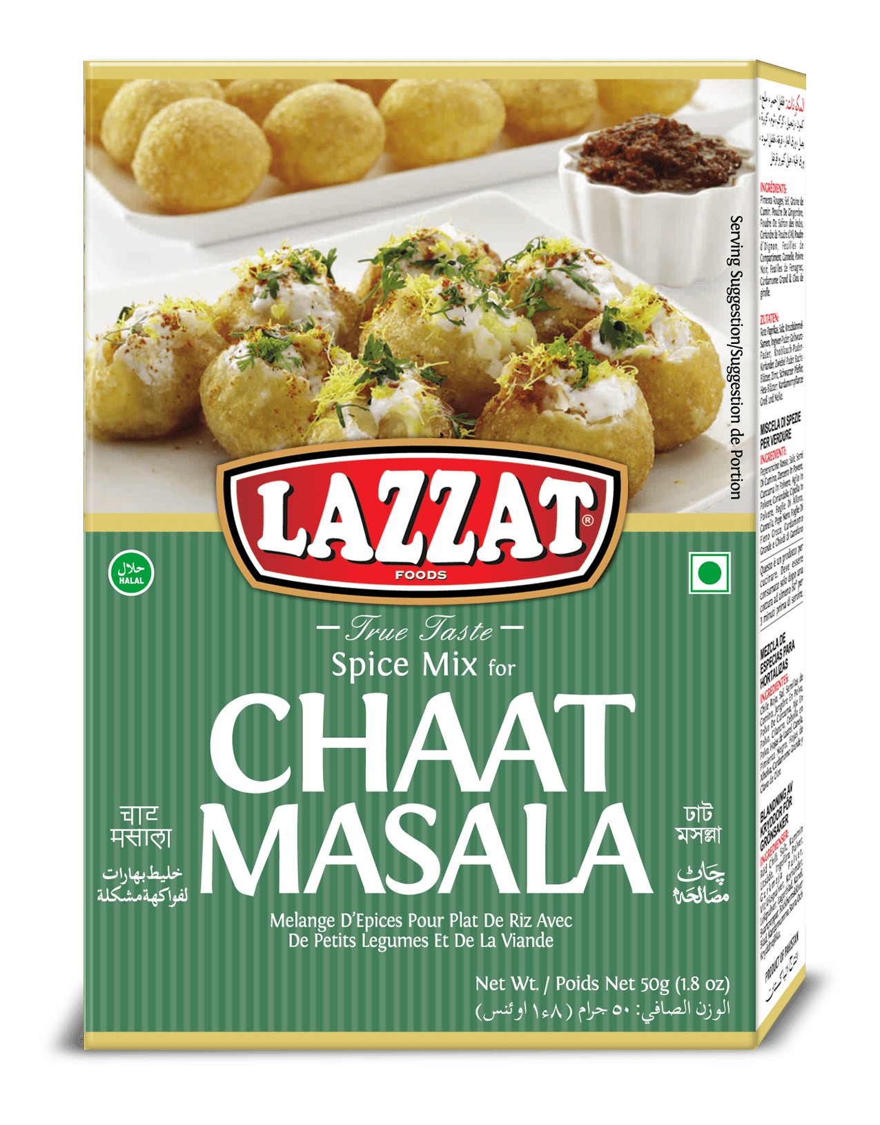 The Lazzat Chaat Masala powder is a fresh take on the traditional spice-mix. This mixture contains freshly ground herbs and spices to create the perfect combination of spicy and tangy flavors.